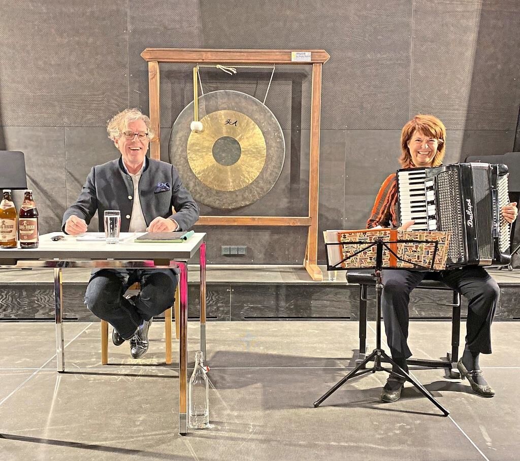 Gestalteten den Abend im „Schwarzen Bua“: Gerald Huber und Maria Reiter. − Foto: KEBNun hatte es die Katholische Erwachsenenbildung im Landkreis FRG gemeinsam mit dem Kulturkreis Freyung möglich gemacht, dass eben dieser Gerald Huber mit der Akkordeonistin Maria Reiter im „Schwarzen Bua“ der Volksmusikakademie über die bierige Menschheitsgeschichte erzählte. Und das auf eine Weise, dass das Gescheiter-Werden große Freude macht.
